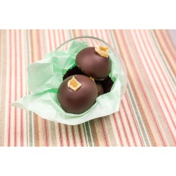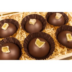 A desszertmarcipánba rejtettünk gyömbér tölteléket, és Lemon Curd krémet ginnel, majd az egészet venezuelai 67 %-os étcsokoládéba mártottuk, és kandírozott gyömbérrel díszítettük.